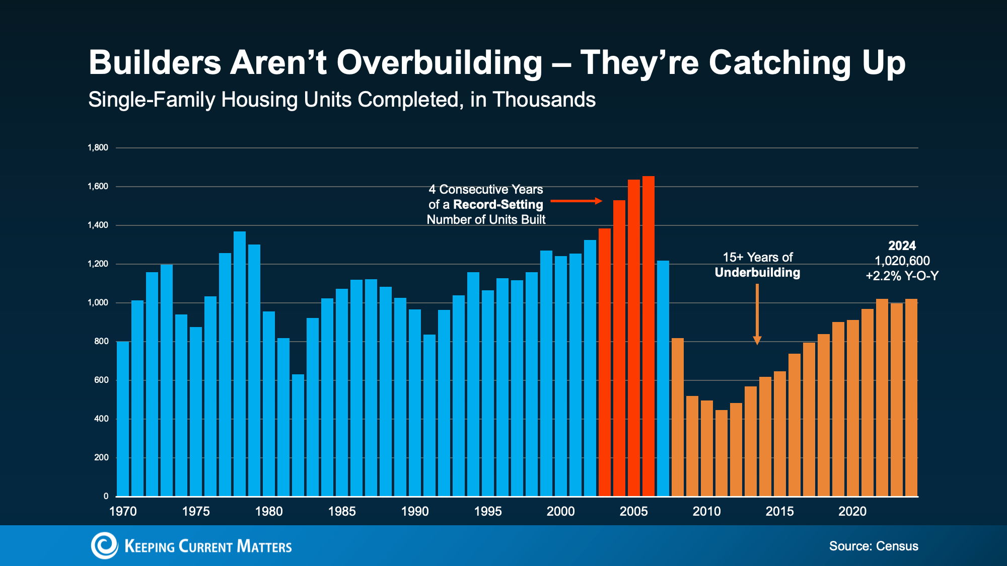 And here’s some other important perspective you’re not going to get from those headlines. After the 2008 crash, builders slammed on the brakes. For 15 years, they didn’t build enough homes to keep up with demand. That long stretch of underbuilding created a major housing shortage, which we’re still dealing with today.
